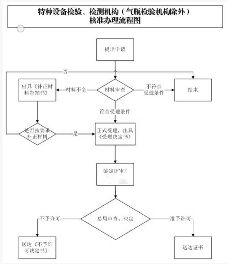 | 审批结果 | 中华人民共和国特种设备检验检测机构核准证 | 办理时限 | 在20个工作日内办结,其中办理过程中所需的鉴定评审时间不计入时限。鉴定评审所用时间主要受到申请单位准备评审以及约定评审时间等因素影响,一般不超过12个月。 |